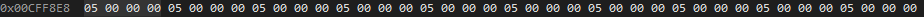 We can see starting at memory address 0x00CFF8E8 we have 10 lots of 4 bytes each containing the number 5. This is how arrays look in memory. Pretty neat!