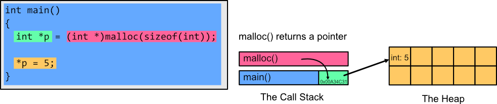 Here we can see that we've asked malloc() to allocate a block of memory the size of one int (4 bytes) to the heap. Once we have our pointer to this block of memory on the heap we can dereference it using the * operator to access